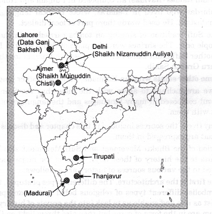 Q10. On an outline map of India, plot three major sufi shrines and three places associated with temples (one each of a form of Vishnu, Shiva and the goddess.)