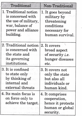 Answer: The “Traditional Notion of Security” covers both the external and internal threats of a country’s security. External threats consist of four components i.e. military threats, threat of war, balance of power, alliance building. Internal threats include maintenance of internal peace and order and recognise cooperative security to limit violence.