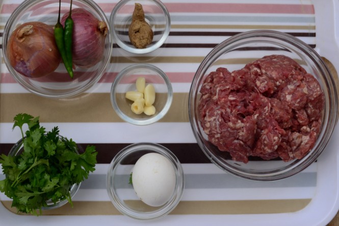 - Mix mutton with onion, garlic, ginger, green chili and dhania leaves.