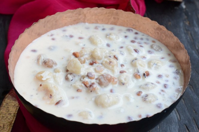 Many important festivals in India, such as the Navratra and Durga Puja, are celebrated throughout India by devotees keeping fasts or vrats. As per the religious sentiments, only specific items are allowed to be eaten during the daytime of these fasts, and one such item is kheer. Kheer can be made with many different ingredients; however, to be true to the festival spirit, I made Meve Ki Kheer today. This milk kheer is made using many different varieties of dry fruits, including makhane or lotus seeds, chironjee, kishmish or raisins, nariyal or coconut, badam or almonds, kaju or cashews and piste or pistachios. And believe me, this mixture not only sounds amazing, but tastes heavenly! I like to serve it chilled, bu you can have this dish hot also.