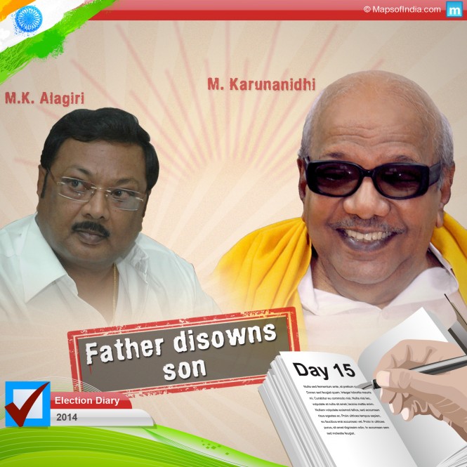 In another development, father disowns the son, literally!!! DMK party Chief M. Karunanidhi had earlier suspended his own son M.K. Alagiri from the party and had denied him the ticket. Now, he has gone one step ahead and asked party members to distance themselves from Alagiri. In case they try to get in touch with him, then disciplinary action can be taken against them. Alagiri who represented Madurai constituency since 2009 was denied ticket this year and the rivalry between him and his younger brother M. K. Stalin has only deepened. Stalin, who is considered the second most important leader after Karunanidhi, has been eating into Alagiri’s vote bank.