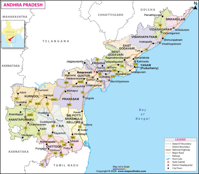 Andhra Pradesh is located in the southeastern part of India. It shares its border with Tamil Nadu in the south, Karnataka in the west, Odisha and Chhattisgarh in the north-east, and Telangana in the north-west. The Bay of Bengal is located to its east.