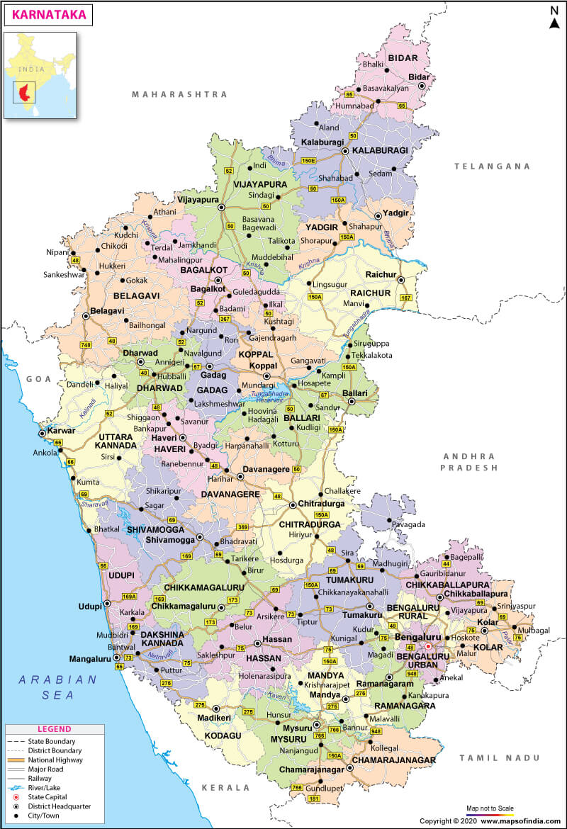 Karnataka lies in the southwestern region of India. It was initially known as the State of Mysore but renamed Karnataka in 1973. The Arabian Sea surrounds it to the west, Goa to the northwest, Maharashtra to the north. Karnataka also shares borders with Telangana to the northeast, Andhra Pradesh to the east, Tamil Nadu to the southeast, and Kerala to the south. Its land borders touch all the four south Indian states. The formation of Karnataka as a state took place on November 1, 1956.