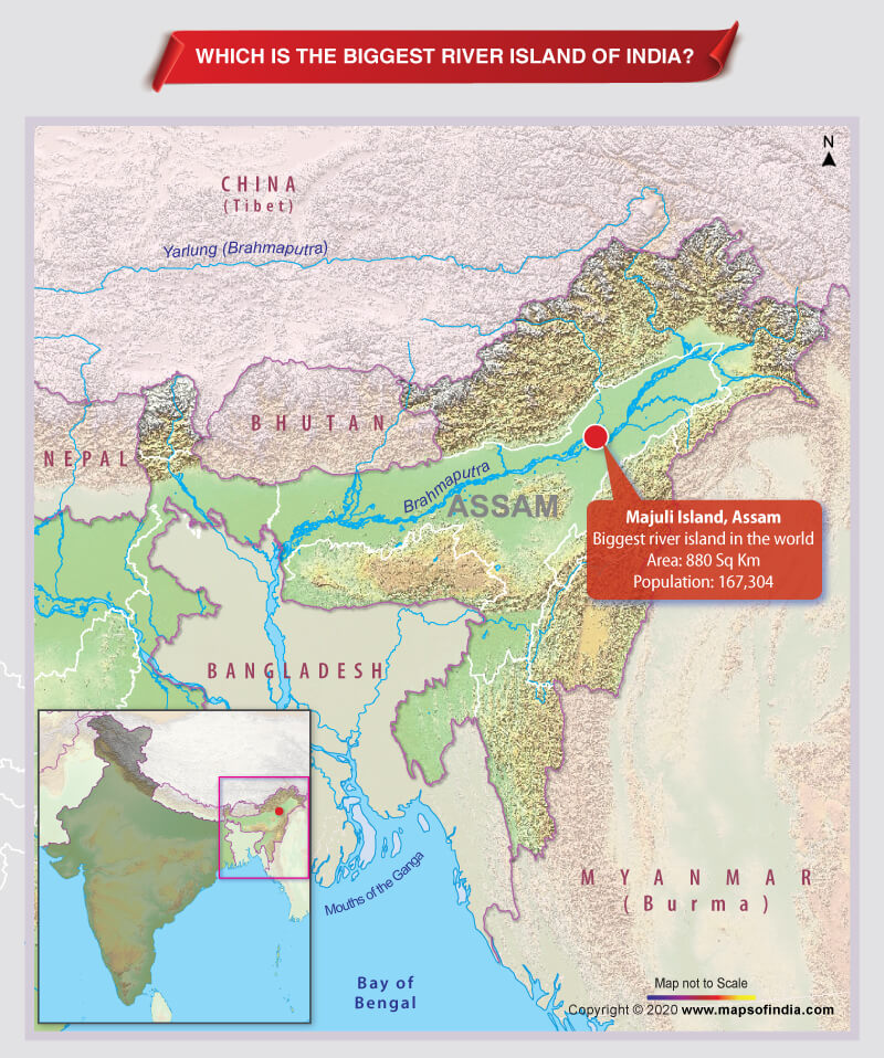 In fact, Majuli is the biggest river island in the world. Located in river Brahmaputra, near Dibrugarh, Assam, Majuli is now the country’s first river island district, having a total area of 880 square kilometers. The island has a population of 167,304 as per the 2011 census. The island was much bigger, about 1,250 square kilometers at the beginning of the 20th century, but due to the changing path of river and soil erosion, the island has lost significant land over time.