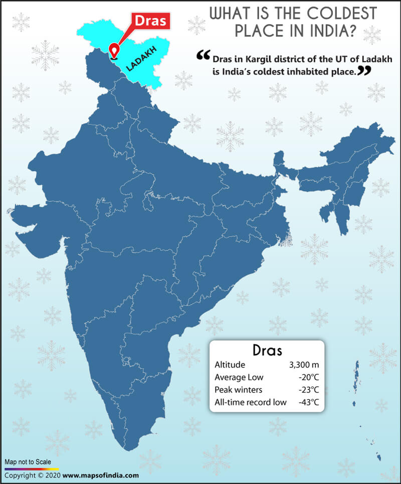 The climate here is of mediterranean continental that is influenced by its altitude (3,300 m). The average low that goes around here is −20 °C and even touch −23 °C during the peak of winters. The winters usually last from mid-October to mid-May. Summers continue from June to early September. The average temperature around these months hovers around 23 °C with little precipitation. Months from December to May receive the most of it. About average of 550 mm snowfall’s water equivalent falls here. The lowest temperature recorded in Dras ever was -60°C on January 9, 1995.