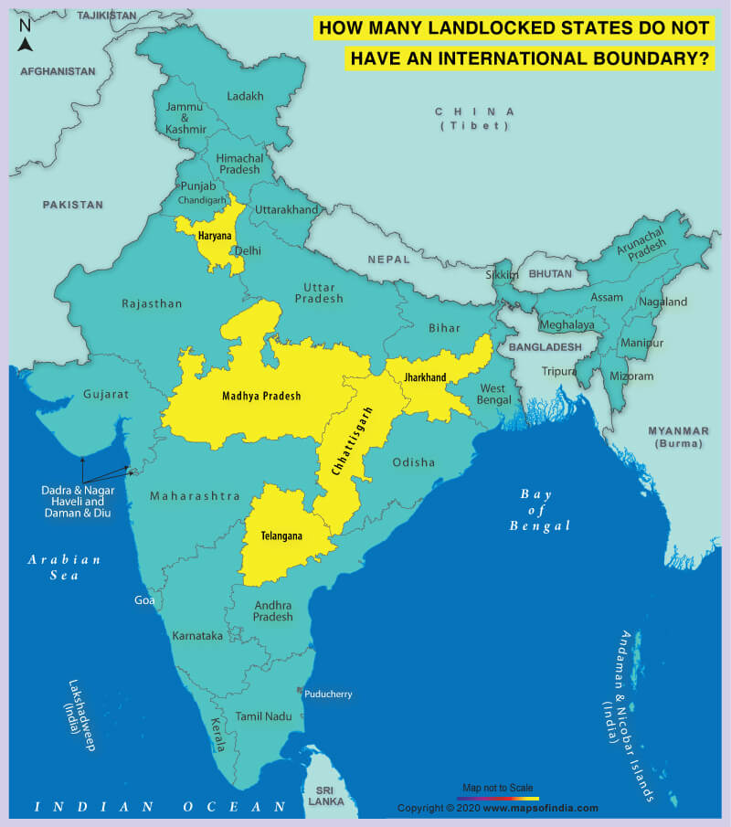 In India, there are 20 landlocked states. Of these, five do not have an international boundary.