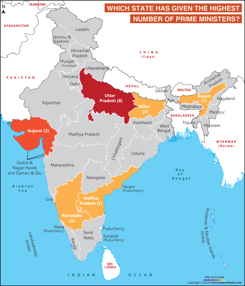 The state of Uttar Pradesh has given India the maximum number of Prime Ministers.
