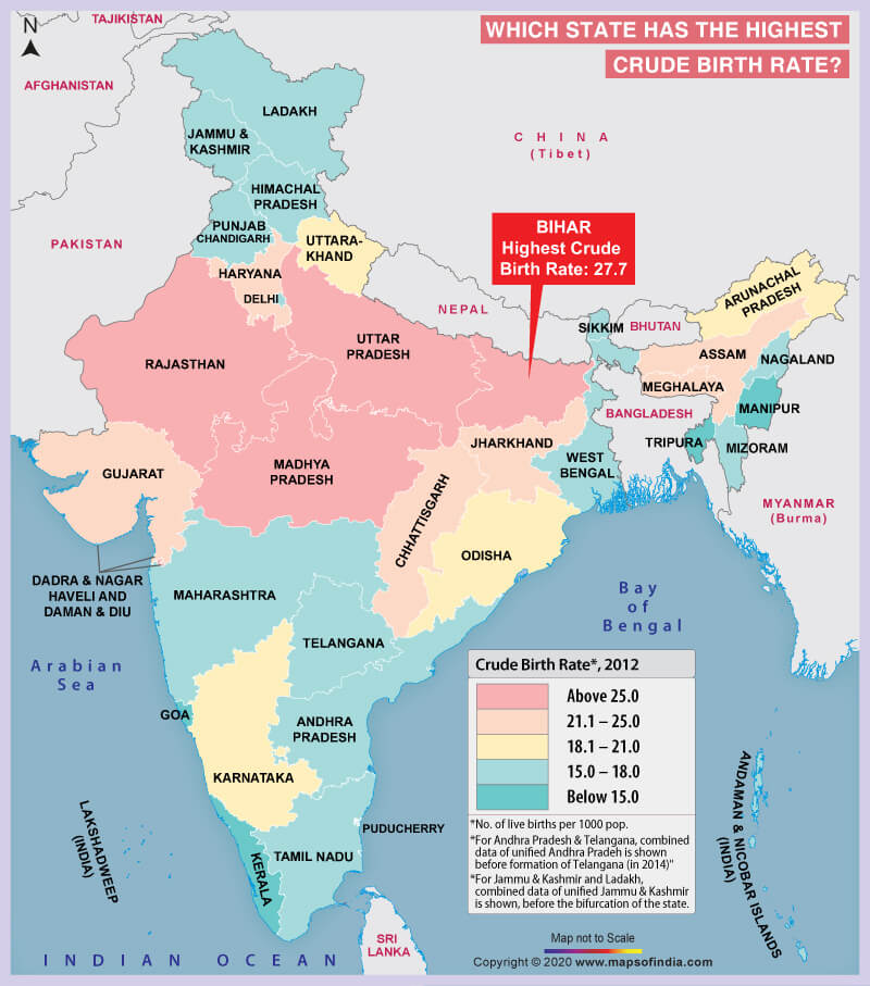 Apart from BIMARU states, Jharkhand, Chhattisgarh, Meghalaya, and Assam are the states which have a crude birth rate higher than the national average of 21.6 which is 24.7, 24.5, 24.1, and 22.5 respectively. Haryana is the state having crude birth rate identical to the national average i.e. 21.6.