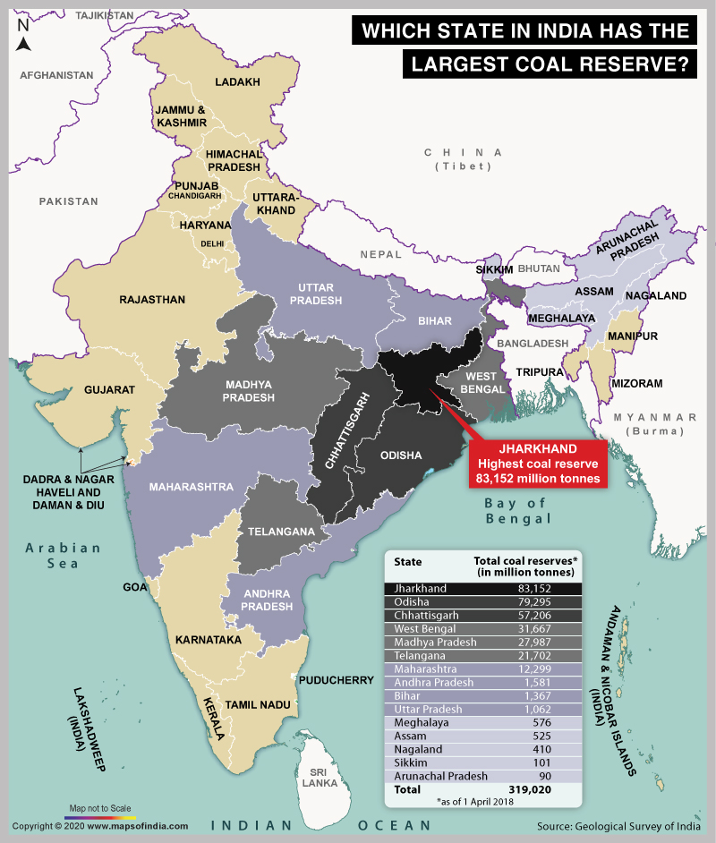 Jharkhand tops the list of coal reserves with an estimated reserve of 83,152 million tonnes. Jharia mines in Dhanbad district is one of the principal coal mines of the state. Magadh mines in Chatra district is expected to be Asia’s biggest coal mine by 2019-20.
