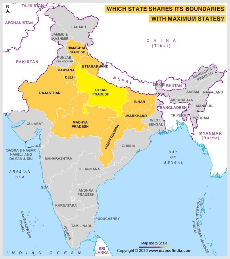 Uttar Pradesh shares its boundaries with maximum states.