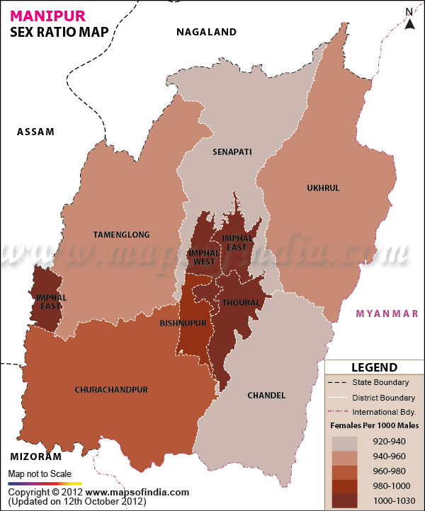 *The Map showing sex ratio in Manipur as per 2011 census of India. Map highlights the females per thousand males.