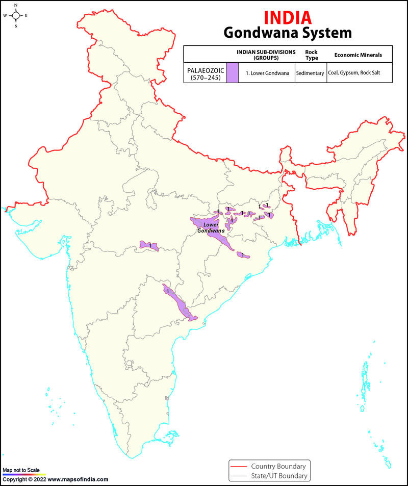Many fissures were formed in peninsular India during the Carboniferous period. Basin-like troughs were formed due to the submergence of the land through these cracks. In these pits, coal was formed due to vegetation suppression and the action of heat and pressure on it. Presently coal is present in the river basins of India like Damodar, Son, Mahanadi, Godavari and Wardha etc.