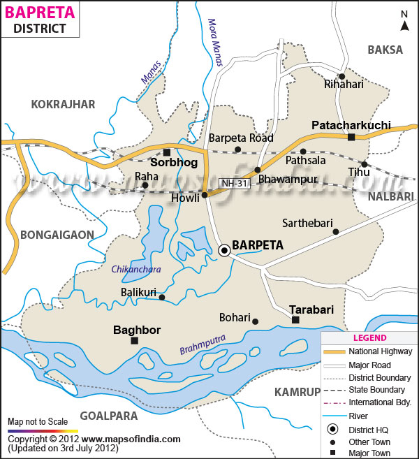 *Barpeta District Map highlights the National Highways, Major Roads, District Headquarter, etc in Barpeta. Disclaimer