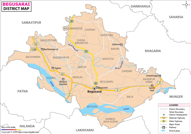| *Begusarai District Map highlights the National Highways, Major Roads, District Headquarter, etc. | Disclaimer |