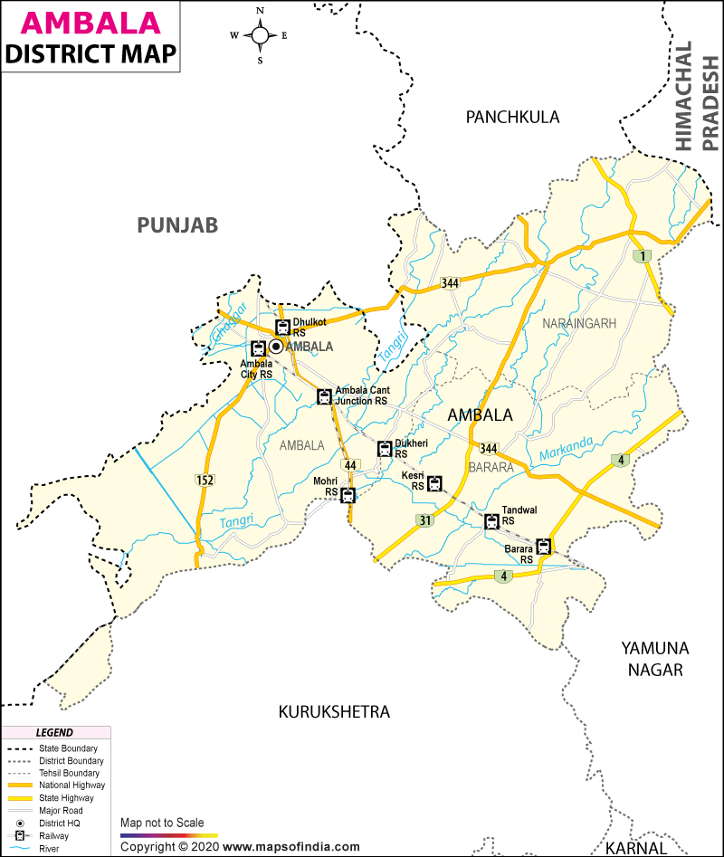 The administrative headquarters of Ambala district is Ambala town. The Ambala district has two sub-divisions, further divided into three tehsils; they are Ambala, Barara and Naraingarh. The district has four constituencies: Naraingarh, Ambala Cantt., Ambala City and Mulana.