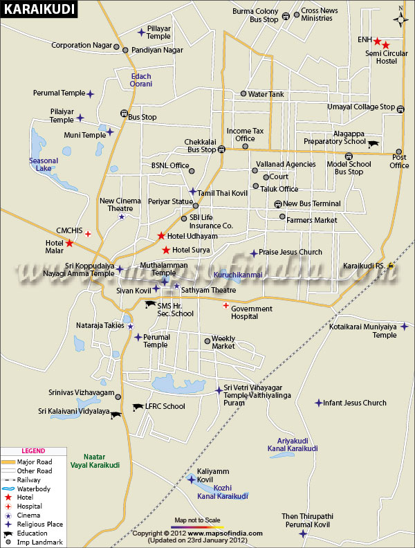 Karaikudi is a well known city also because of the type of houses built there using limestone which is called "Karai Veedu" and also because of a plant called "Karai" which grows profusely in the region. The topography of Karaikudi is primarily flat with a few rocky areas. The River Thennar flows through the south of Karaikudi and the soil of the area is hard red lateritic and is not suitable for cultivation.