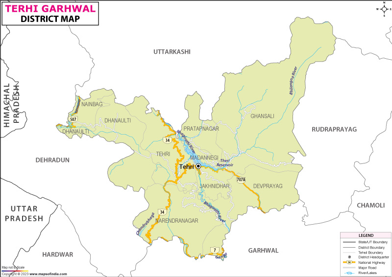| *Map showing National Highway, Major Roads, District Headquarters, Major Towns, Rivers and etc in Tehri Garhwal District. | Disclaimer |