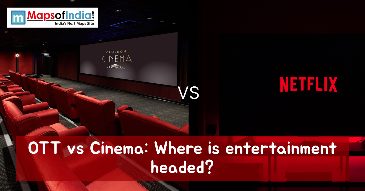 Split image showing an empty red-seated cinema hall on one side and a Netflix logo on the other, with text reading ‘OTT vs Cinema: Where is entertainment headed?’ and a MapsofIndia logo at the top.