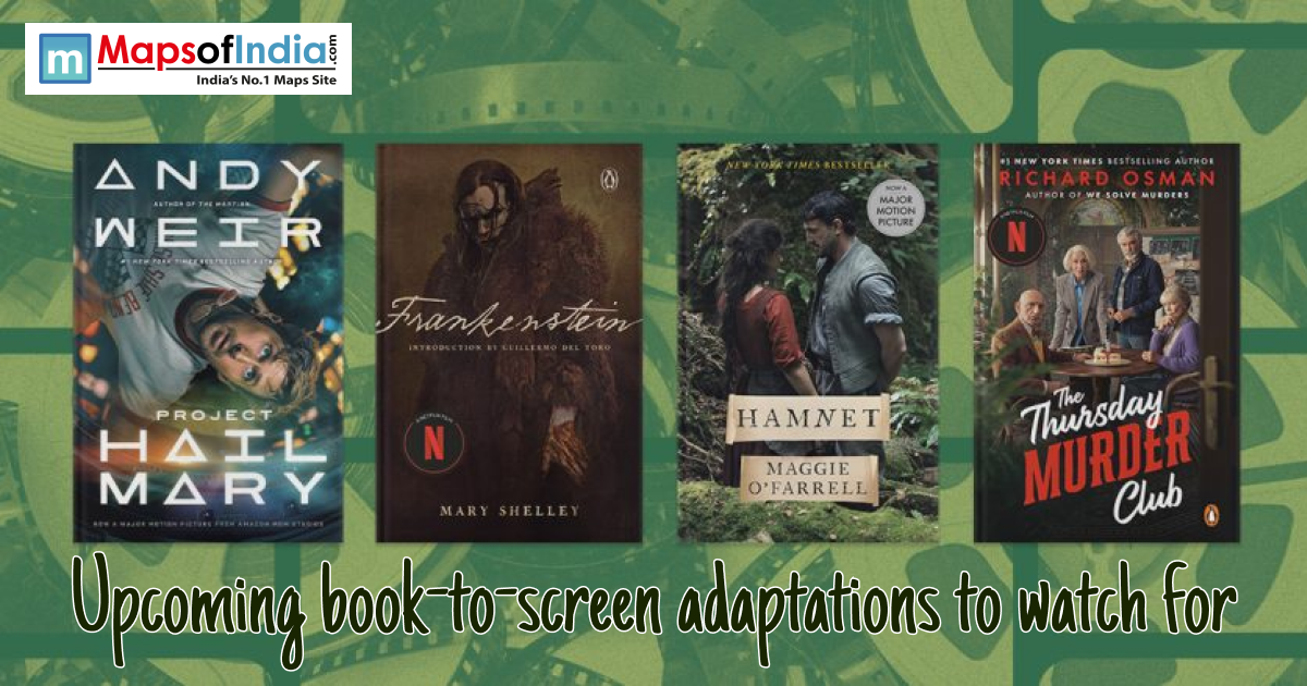 Graphic showcasing book covers of upcoming book-to-screen adaptations, including Project Hail Mary, Frankenstein, Hamnet, and The Thursday Murder Club, with the text “Upcoming book-to-screen adaptations to watch for” and Maps of India branding
