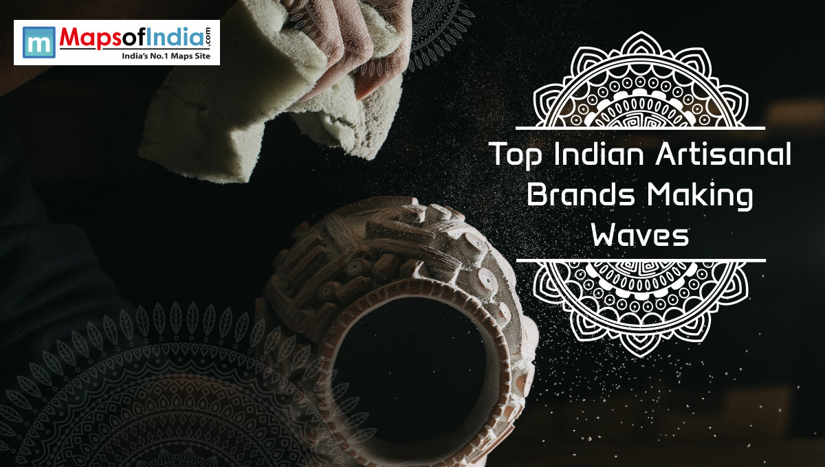 A close-up of an artisan dusting a handcrafted clay pot, with decorative mandala designs and the text “Top Indian Artisanal Brands Making Waves” displayed on a dark background alongside the Maps of India logo