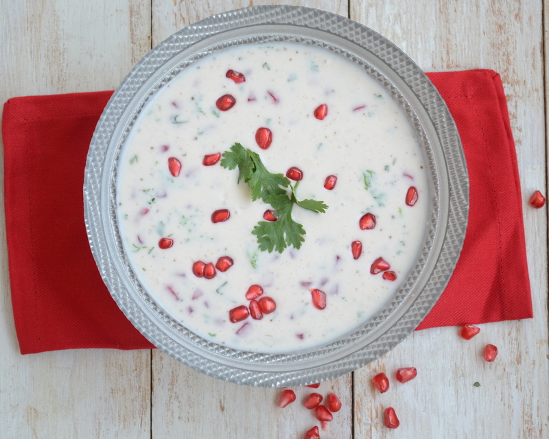 With many recipes, we recommend an accompanying raita. So here is an excellent option of making a nice looking raita with red seeds of pomegranate fruit or anaar called anaar ka raita. Pomegranates are one of the most ancient of the fruits, extremely tasty and are rich in vitamin C and a good source of dietary fiber. It has been many years since I’ve been preparing and having anaar ka raita, I still remember I had it for the first time at a restaurant and immediately fell in love with it. The raita always turns out so well that I hardly ever have any left over. Anaar ka raita has just the right amount of balance of taste as sweet, tangy and salty. Its a low-calorie, very healthy and tasty raita. The pomegranate comes in either white or red seeds, however I recommend using the red variety as the red pomegranate seeds stand out and enhance the appeal of your meal table along with the taste. The raita should always be serve chilled and does wonders to the taste of your biryani, pulao, curries or plain dal and rice. Use this easy-to-follow recipe to impress your guests with the look, feel and taste of your raita.