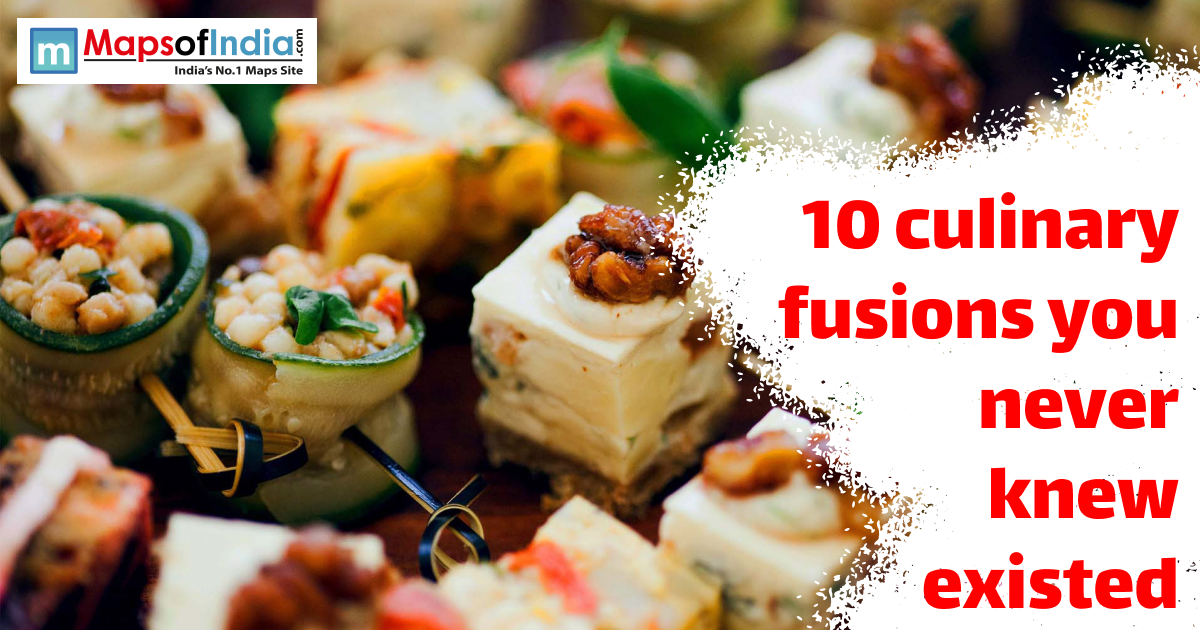 An assortment of gourmet fusion appetizers displayed on a platter with the text ‘10 culinary fusions you never knew existed’ beside them.