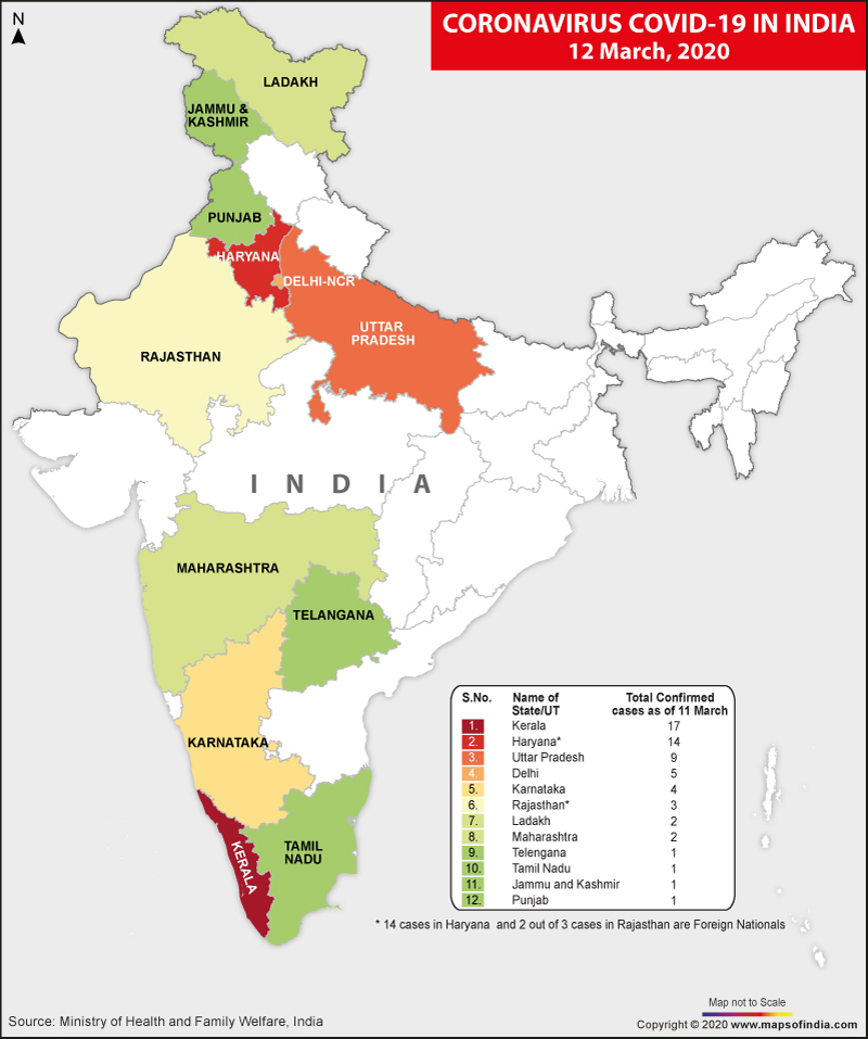 Map Showing Coronavirus Pandemic in India as per March 12, 2020
