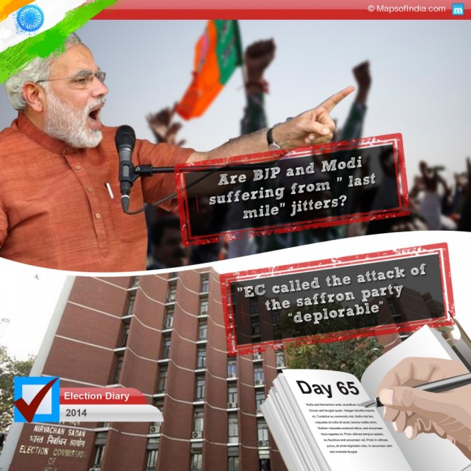Are Modi and BJP suffering from “last mile” jitters? Are they feeling weighed down by somewhat unrealistic expectations put on them by supporters and pollsters? These are some of the questions which were raised by political pundits and leaders of opposition parties today as a high voltage battle raged on between BJP and Election Commission. The party cried hoarse about EC’s alleged bias and the constitutional authority minced no words in rejecting the allegations. Meanwhile Congress today tried to turn the tables on Modi’s caste credentials by claiming that he is originally from an upper caste!!