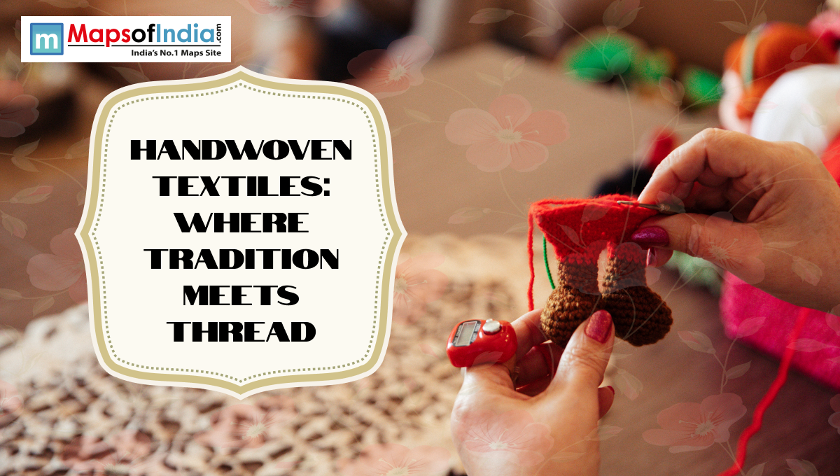 Hands weaving a small handmade textile piece with red thread and needle, alongside the title “Handwoven Textiles: Where Tradition Meets Thread” displayed on the left