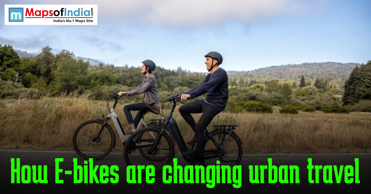 Two adults wearing helmets ride electric bikes along a scenic road with green hills in the background, with the text “How E-bikes are changing urban travel” and a Maps of India logo displayed