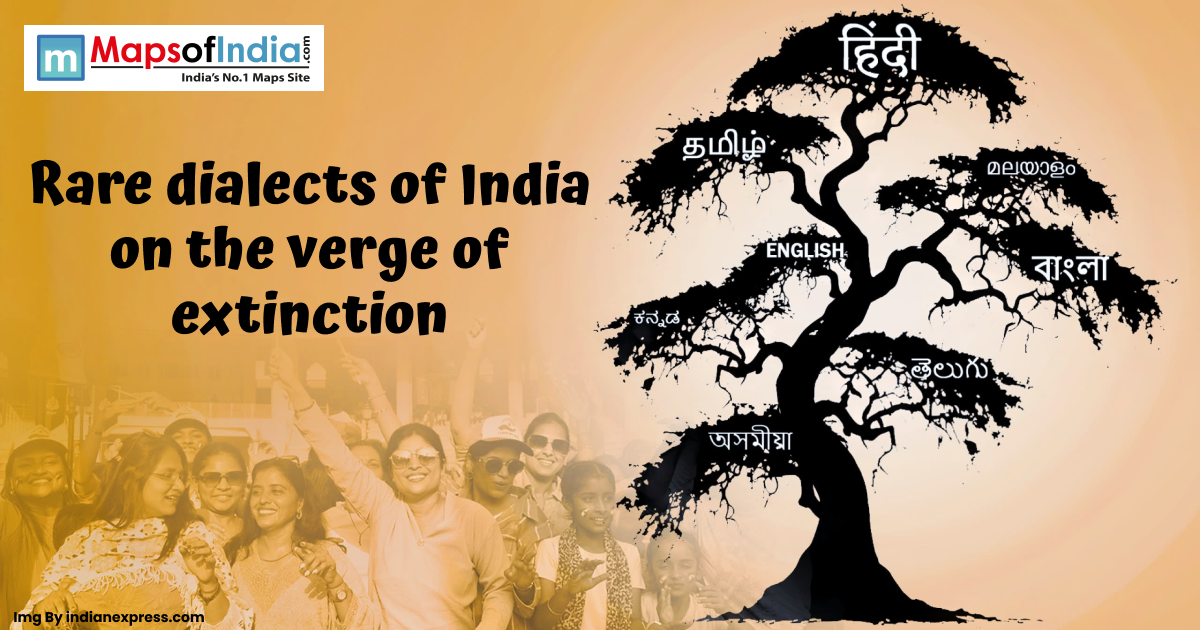 Infographic titled "Rare dialects of India on the verge of extinction" featuring a tree silhouette with branches labeled in various Indian scripts.