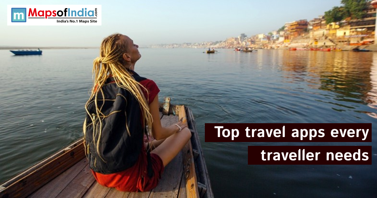 A solo traveler with a backpack sitting on a wooden boat, gazing across a calm river with boats and historic riverside buildings in the background, promoting top travel apps for travelers.