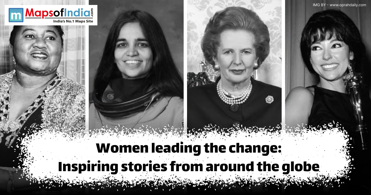 Collage of four influential women from different backgrounds, shown in black and white, representing global female leaders. The image includes the text ‘Women leading the change: Inspiring stories from around the globe’ with the Maps of India logo at the top.