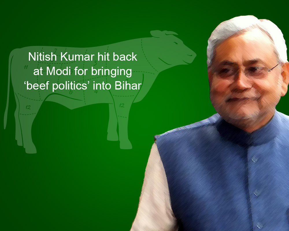 Speaking at a rally at Samastipur yesterday, Nitish Kumar hit back at Narendra Modi for trying to bring ‘beef politics’ into Bihar by reeling out statistics to show meat exports had actually gone up under Narendra Modi’s rule, in both Gujarat and at the centre.