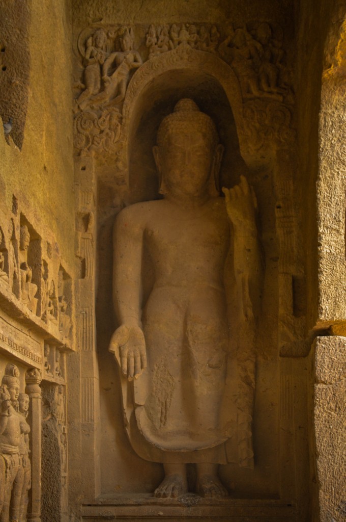 The imposing Buddha figure guarding the gate of Kanheri Caves