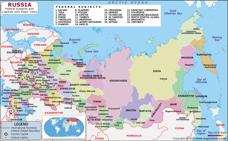 Russia, earlier was the leading republic within the Union of the Soviet Socialist Republic (U.S.S.R.) and became an independent country after the Soviet Union dissolution in December 1991. Russia is officially known as the Russian Federation. It is a country located in Eastern Europe and Northern Asia. With a total land area of 17,098,246 square kilometers, it is the largest country in the world by landmass, as depicted in the Russia map above. Its capital and largest city is Moscow, which is home to over 12 million people. Russia has a population of approximately 146,099,558 people, making it the ninth most populous country in the world. Its population is diverse, with ethnic Russians making up the majority, followed by Tatars, Ukrainians, Bashkirs, and Chuvash. Russia is known for its rich history, culture, and natural resources, including its vast reserves of oil, gas, and minerals. At present, Russia is a vast nation stretching across all of northern Asia and much of eastern Europe, covering 11 time zones. Its diverse landscape includes everything from deserts and semiarid steppes to dense forests and the frozen tundra of the Arctic. Among its many natural wonders, Russia boasts Europe’s longest river, the Volga, and its largest lake, Ladoga. The country is also home to Lake Baikal, the deepest lake in the world, which holds a significant portion of the planet's fresh water.
